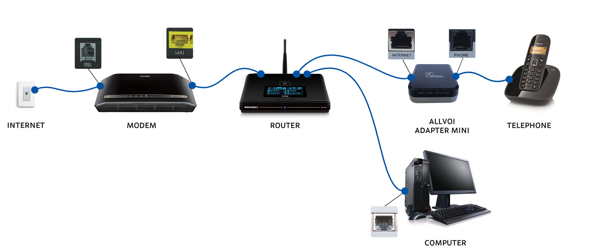 Its compact and ergonomic design is perfect for every home user. Just connect it to the Internet Router and any Touch-Tone phone and you can start making and receiving calls with ALLVOI.